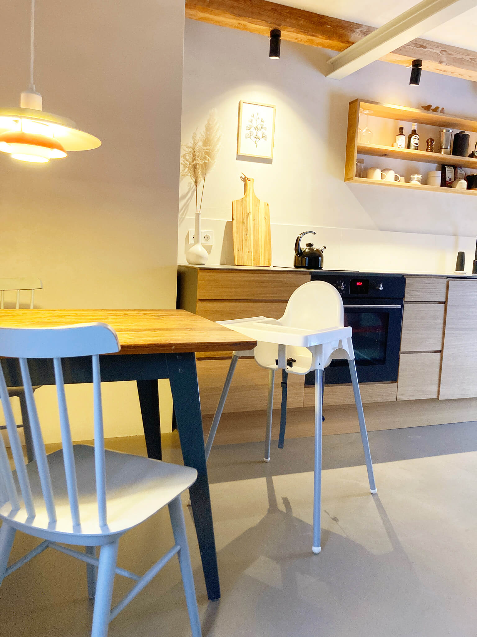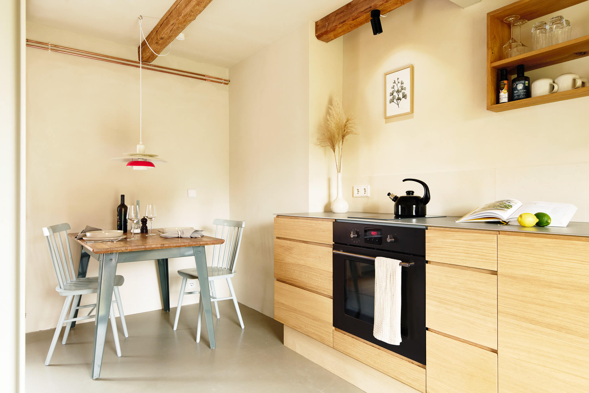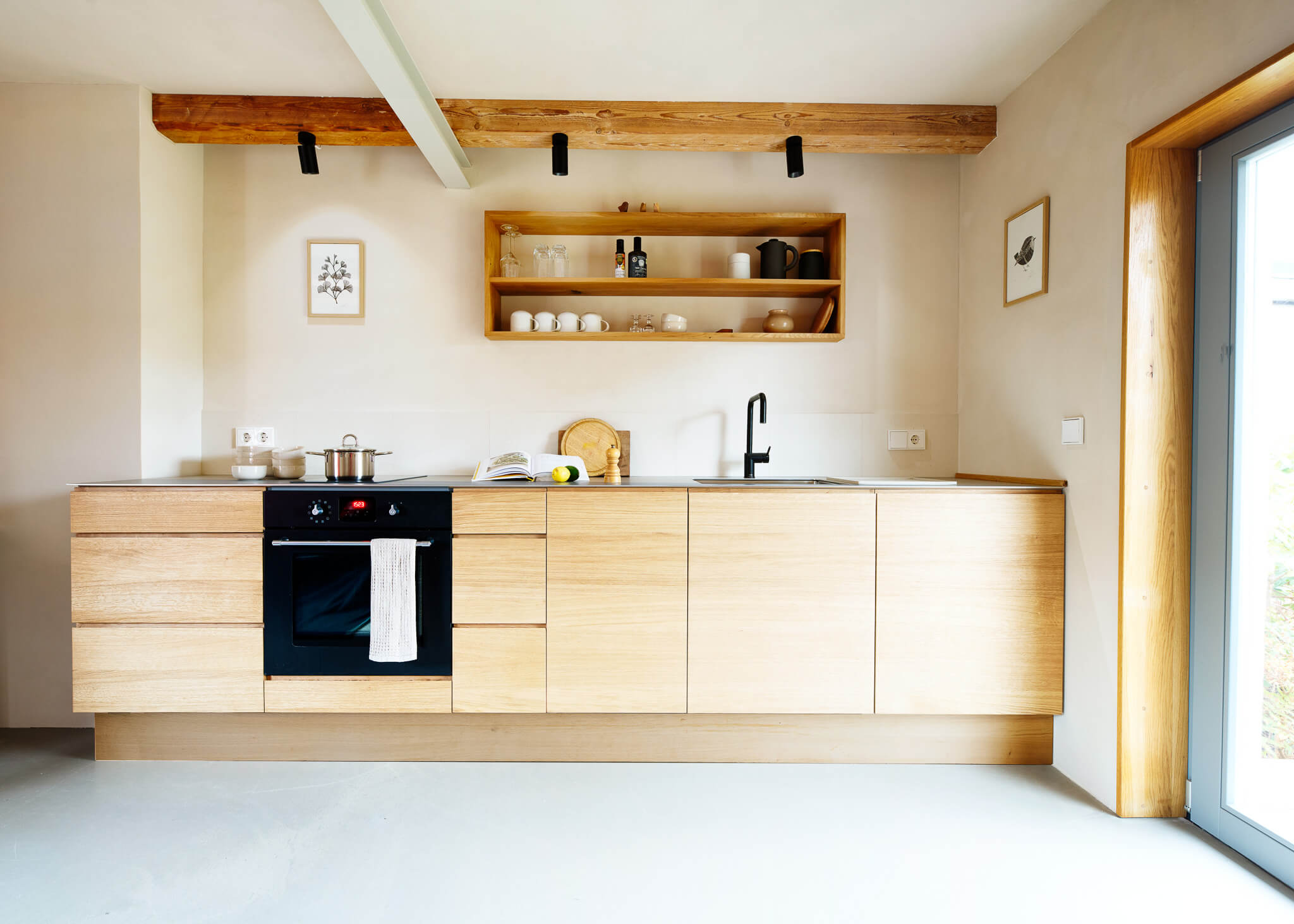 Reduziert auf das Wesentliche – und doch mit allem, was das Leben schön macht. Die offene Küche aus geöltem Eichenholz lädt dazu ein, mit einem Glas Wein und guten Zutaten den Abend einzuläuten. Sichtbare Stahlträger, natürliche Materialien und liebevoll gewählte Details schaffen eine Atmosphäre von Klarheit und Wärme.