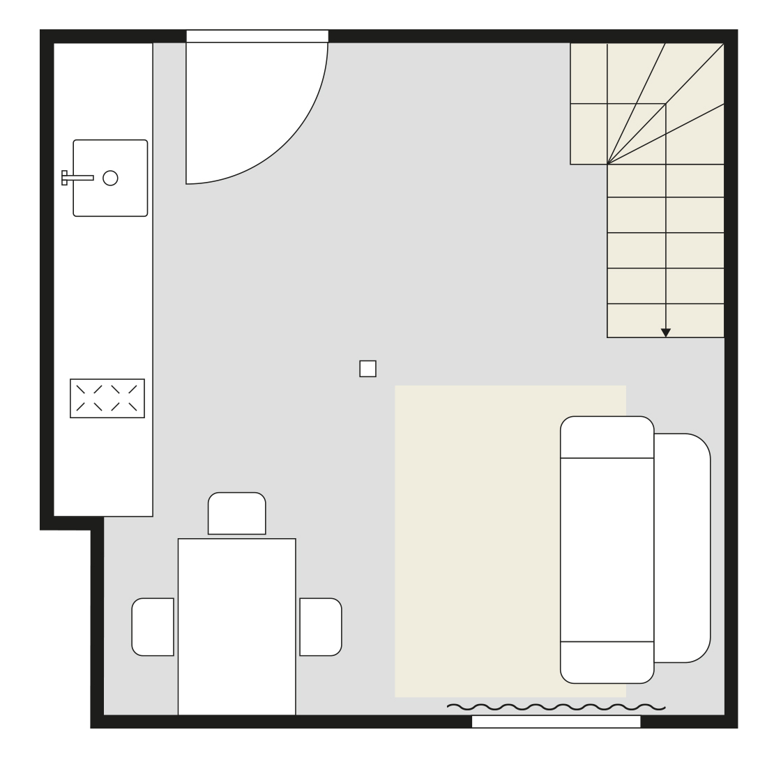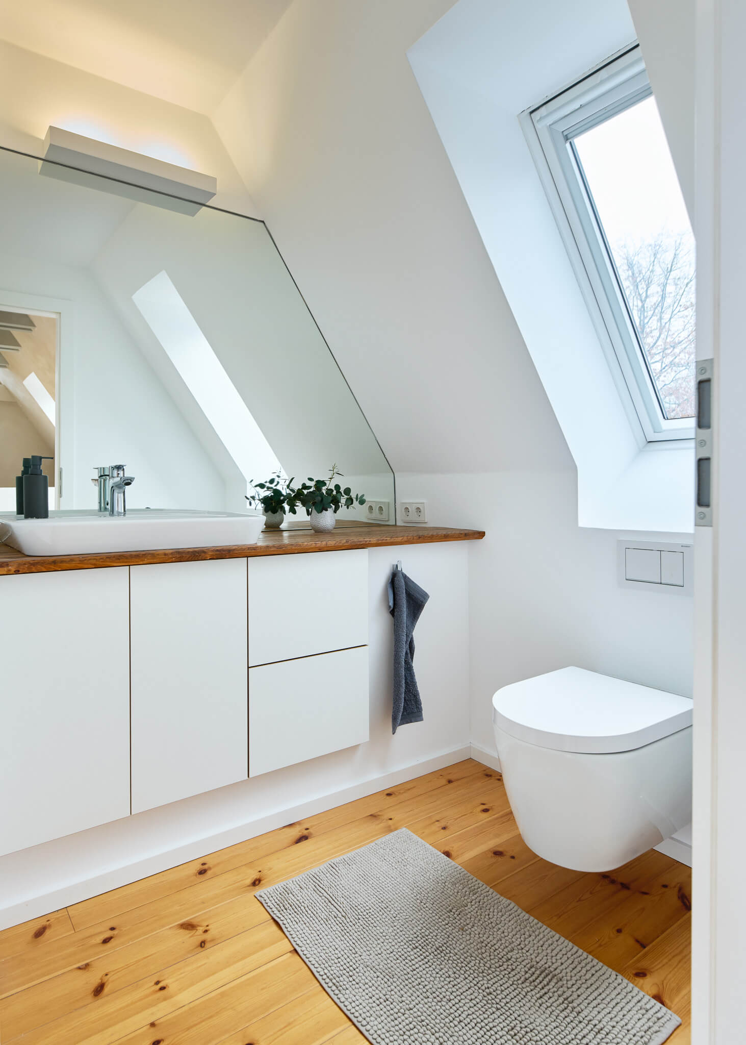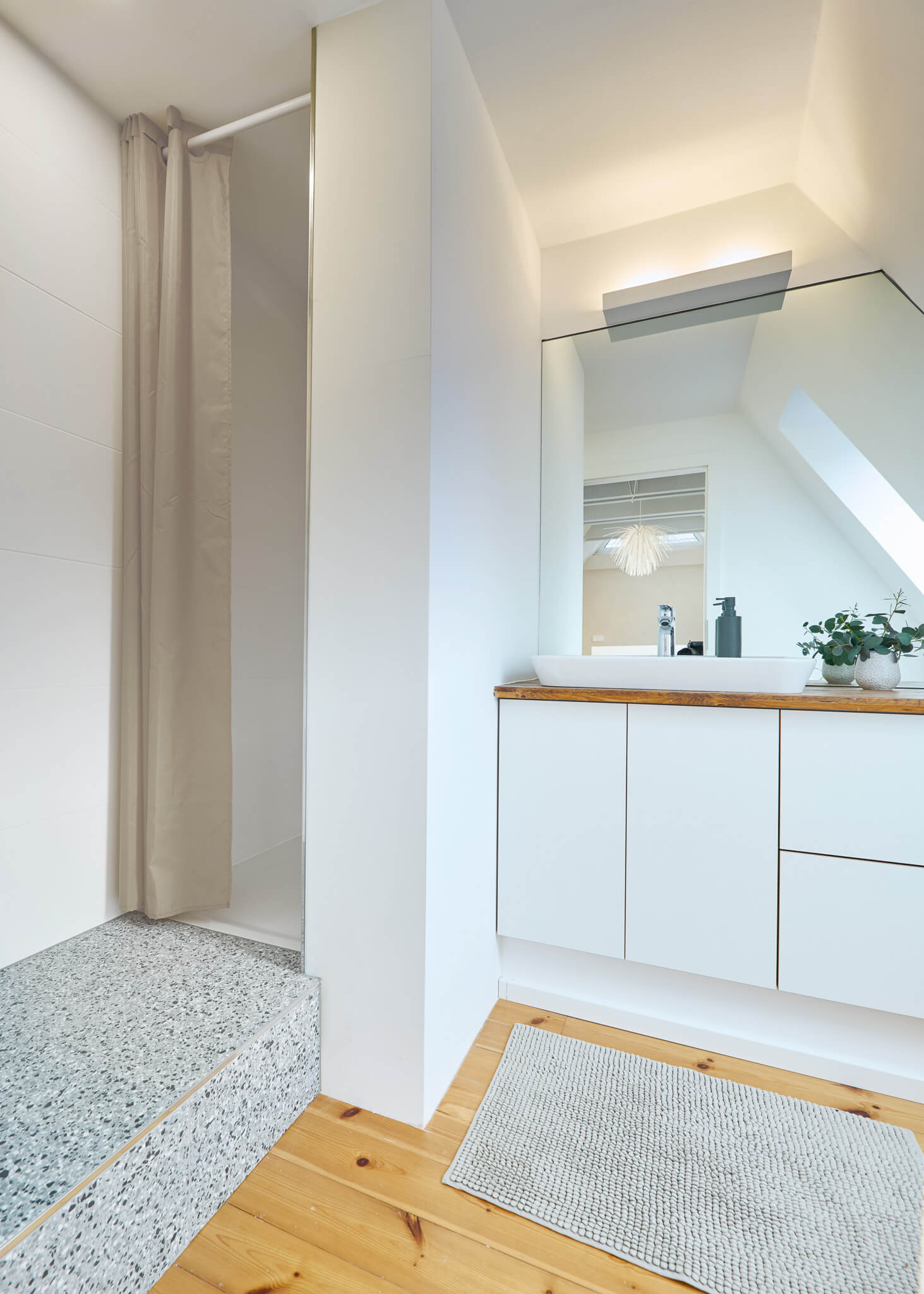 Reduziert auf das Wesentliche – und doch mit allem, was das Leben schön macht. Die offene Küche aus geöltem Eichenholz lädt dazu ein, mit einem Glas Wein und guten Zutaten den Abend einzuläuten. Sichtbare Stahlträger, natürliche Materialien und liebevoll gewählte Details schaffen eine Atmosphäre von Klarheit und Wärme.