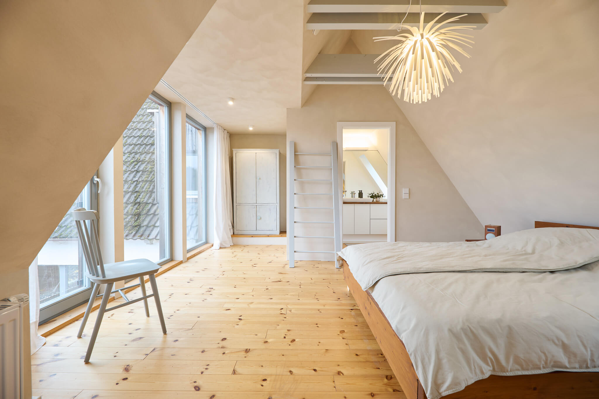 Unter dem offenen Dachfirst erwacht das Gefühl von Weite und Leichtigkeit. Das große Fenster lässt tagsüber das Licht herein und nachts den Sternenhimmel – direkt vom Bett aus. Ein Ort zum Innehalten, Ausruhen, Durchatmen.